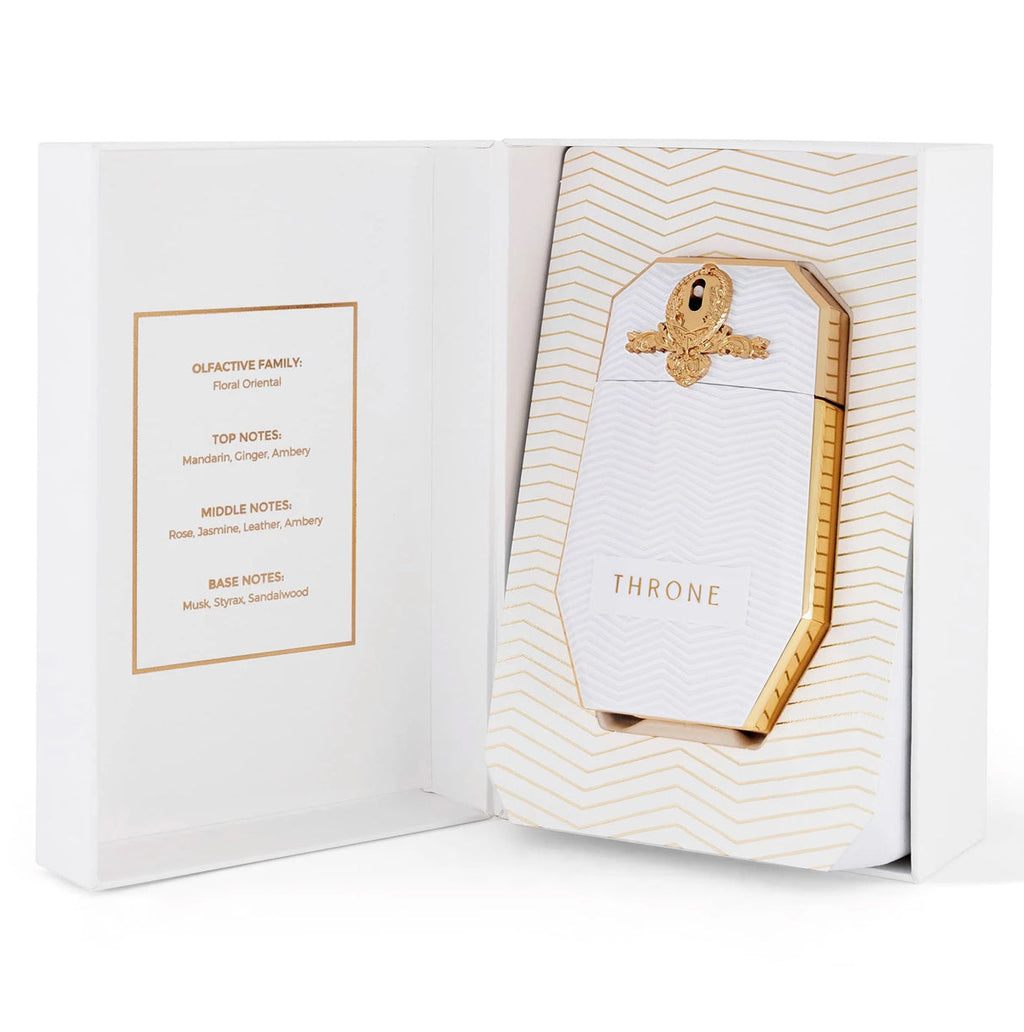 Throne stands as a symbol of grace and power — a floral oriental blend of mandarin and ambery roses wrapped in soft leather and sandalwood.