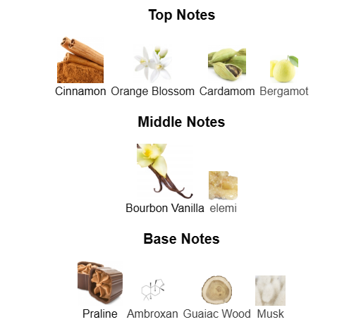 Top Notes: Cinnamon, Cardamom, Orange Blossom, Bergamot